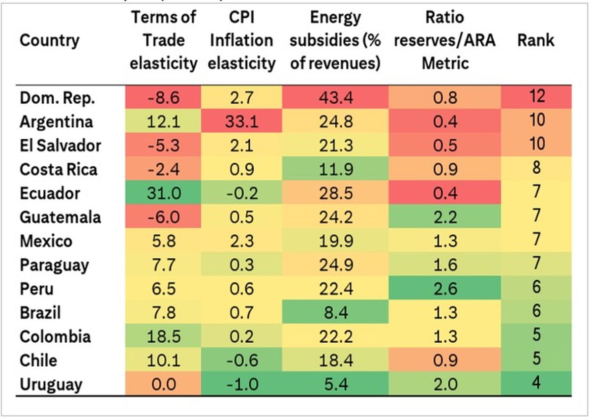 El documento señala que Uruguay tiene una mayor flexibilidad de política monetaria, menor exposición a subsidios energéticos, un nivel adecuado de reservas internacionales y una balanza comercial relativamente flexible frente a shocks externos. En el ranking, Uruguay es seguido de Chile, Colombia y Brasil.