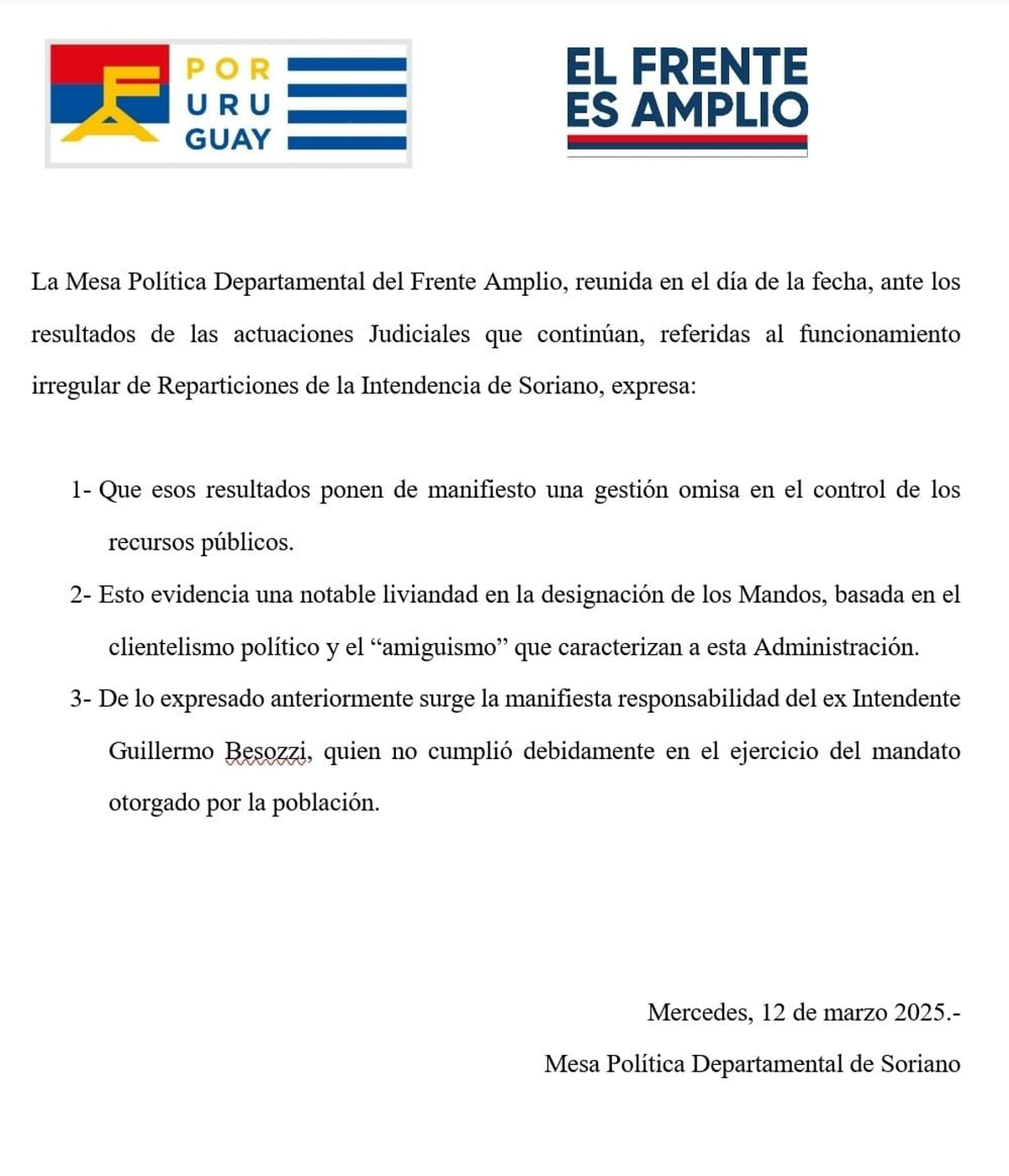 El Frente Amplio de Soriano emitió una declaración el miércoles de noche en la que responsabiliza al ex intendente Besozzi por la situación: