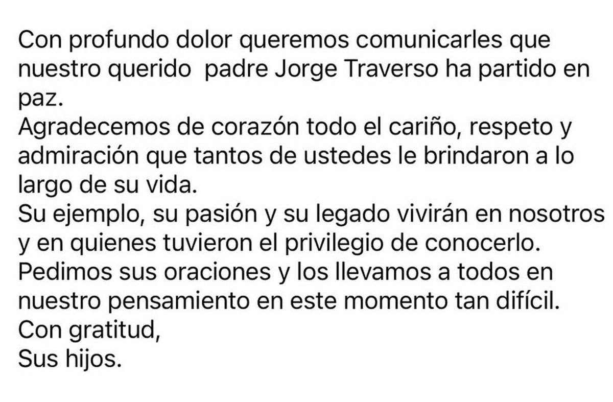 "Con profundo dolor queremos comunicarles que nuestro querido padre Jorge Traverso ha partido en paz. Agradecemos de corazón todo el cariño, respeto y admiración que tantos de ustedes le brindaron a lo largo de su vida. Su ejemplo, su pasión y su legado vivirán en nosotros y en quienes tuvieron el privilegio de conocerlo. Pedimos sus oraciones y los llevamos a todos en nuestro pensamiento en este momento tan difícil. Con gratitud, sus hijos".