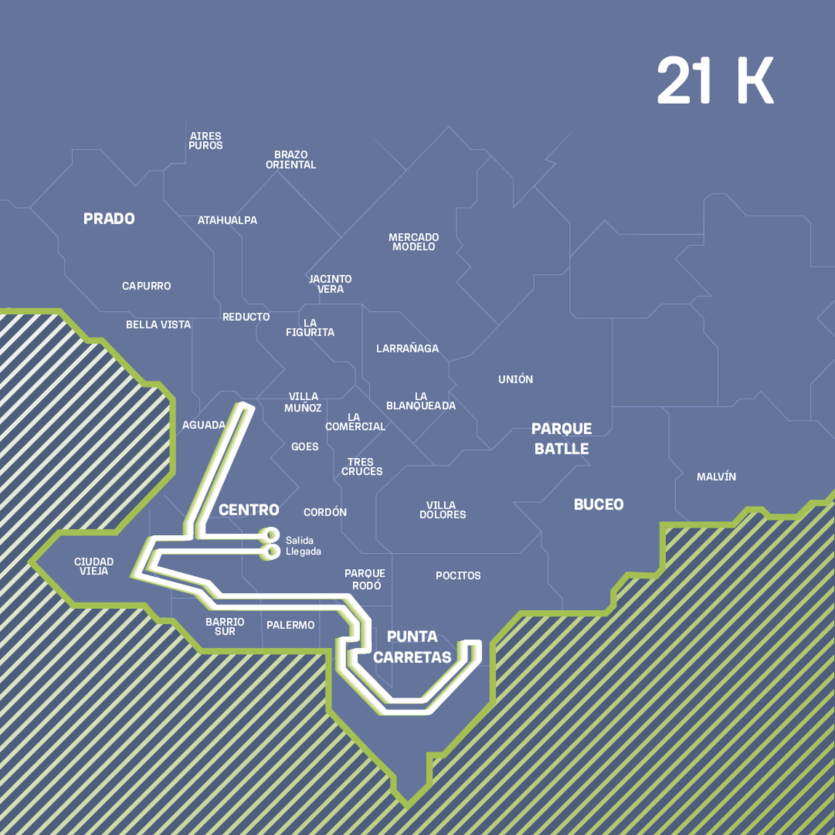 Salida IMM, avenida 18 de Julio, Río Negro, Avenida Del Libertador, Av. de las Leyes, Av. Agraciada, Av. Joaquín Suárez, Lucas Obes, Av. Delmira Agustini, Av. Buschental, Av. Alfonsina Storni (senda Oeste a contramano), Av. Gabriela Mistral (rotonda a contramano), Av. Alfonsina Storni (senda Este a contramano), Av. Luis A de Herrera, Marne, Av. Jacobo Varela (senda Sur), Pres. Ing. José Serrato, Av. Dámaso A. Larrañaga, Joanicó, Av. Luis A. de Herrera, Av. Centenario, Av. Américo Ricaldoni, Av. Federico Vidiella, Av. Ramón Benzano, Dr. Américo Ricaldoni (contra el parque a contramano), Dr. Alfredo Navarro (carril hacia Av. Ramón Anador), Av. Ramón Anador (senda hacia Dr. Luis A. de Herrera), Av. Luis A. de Herrera (senda hacia rambla), rambla Armenia al Este, rambla Rep. de Chile, rambla O'Higgins, retorno en Rimac, rambla O'Higgins hacia el Centro, rambla Rep. de Chile, rambla Armenia, rambla Rep. del Perú, rambla Gandhi, rambla Pte. Wilson, rambla Rep. Argentina, rambla Gran Bretaña, Ciudadela, Plaza Independencia, Av. 18 de Julio, llegada en IMM.