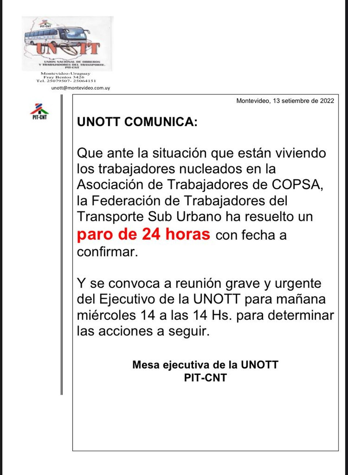 La Unión Nacional de Obreros y Trabajadores del Transporte (UNOTT) anunció un paro de los ómnibus suburbanos por 24 horas y con fecha a definir. La medida se decidió en apoyo a los trabajadores de COPSA, que mantienen sus medidas por tiempo indeterminado.