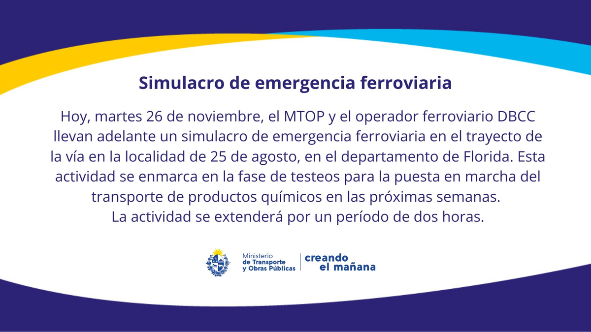 El Ministerio de Transporte y Obras Públicas (MTOP) informó que realiza este martes en el mediodía un simulacro de emergencia ferroviaria en el departamento de Florida.