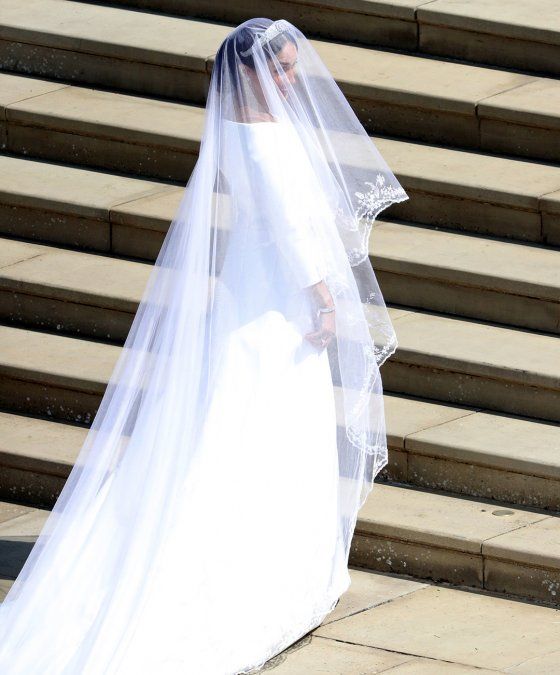 La flamante duquesa de Sussex, de 36 años, optó por un traje de corte sencillo, moderno y elegante que ensalzaba su figura, con escote de barco, mangas tres cuartos, cola y un velo muy largo con bordados en los extremos.