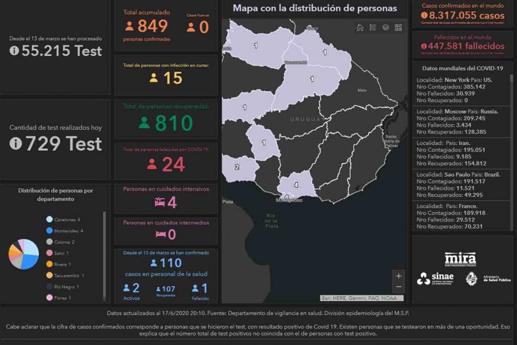 Uruguay no registró casos nuevos de coronavirus COVID-19 este miércoles, por lo que la cifra de casos positivos acumulados se mantiene en 849 en todo el territorio. De ese total, 810 ya se recuperaron y 24 pacientes fallecieron.