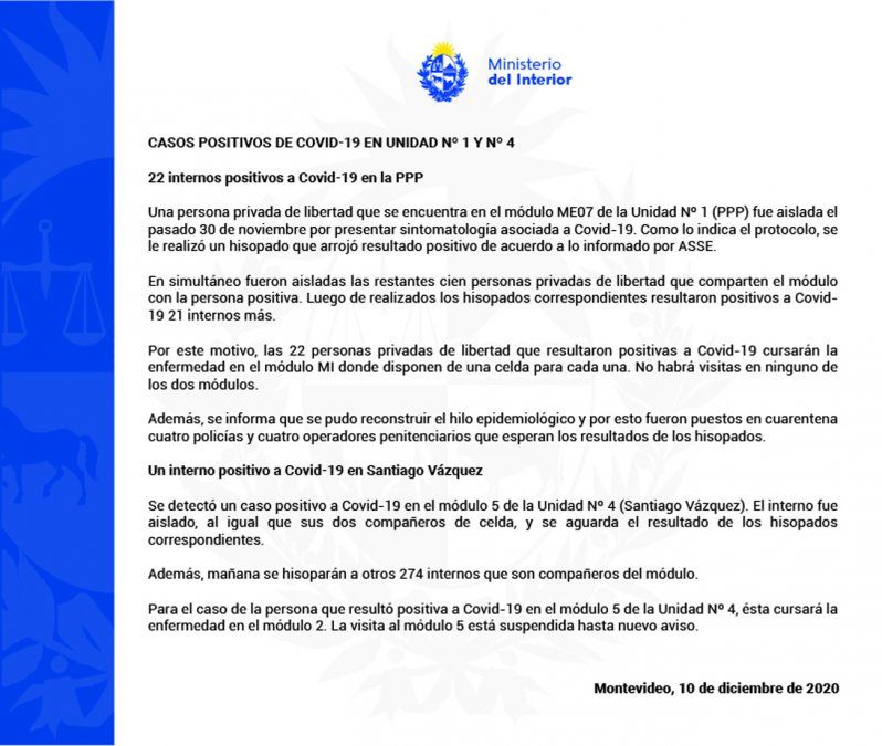 El Ministerio del Interior informa que fueron suspendidas las visitas en los módulos donde se detectaron los casos de coronavirus, tanto en Punta de Rieles como en Santiago Vázquez.
