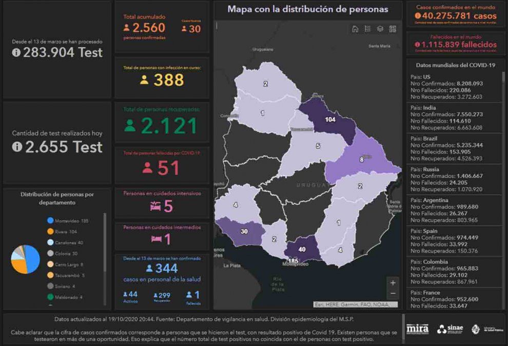 Este lunes se registraron 30 casos nuevos de Coronavirus Covid-19, en una base de 2.655 análisis procesados, lo que da una cifra dotal de 2.560 casos positivos acumulados desde que comenzó la emergencia sanitaria en marzo. Del total de casos nuevos, 16 son de Montevideo, 12 son de Rivera y dos de Canelones.