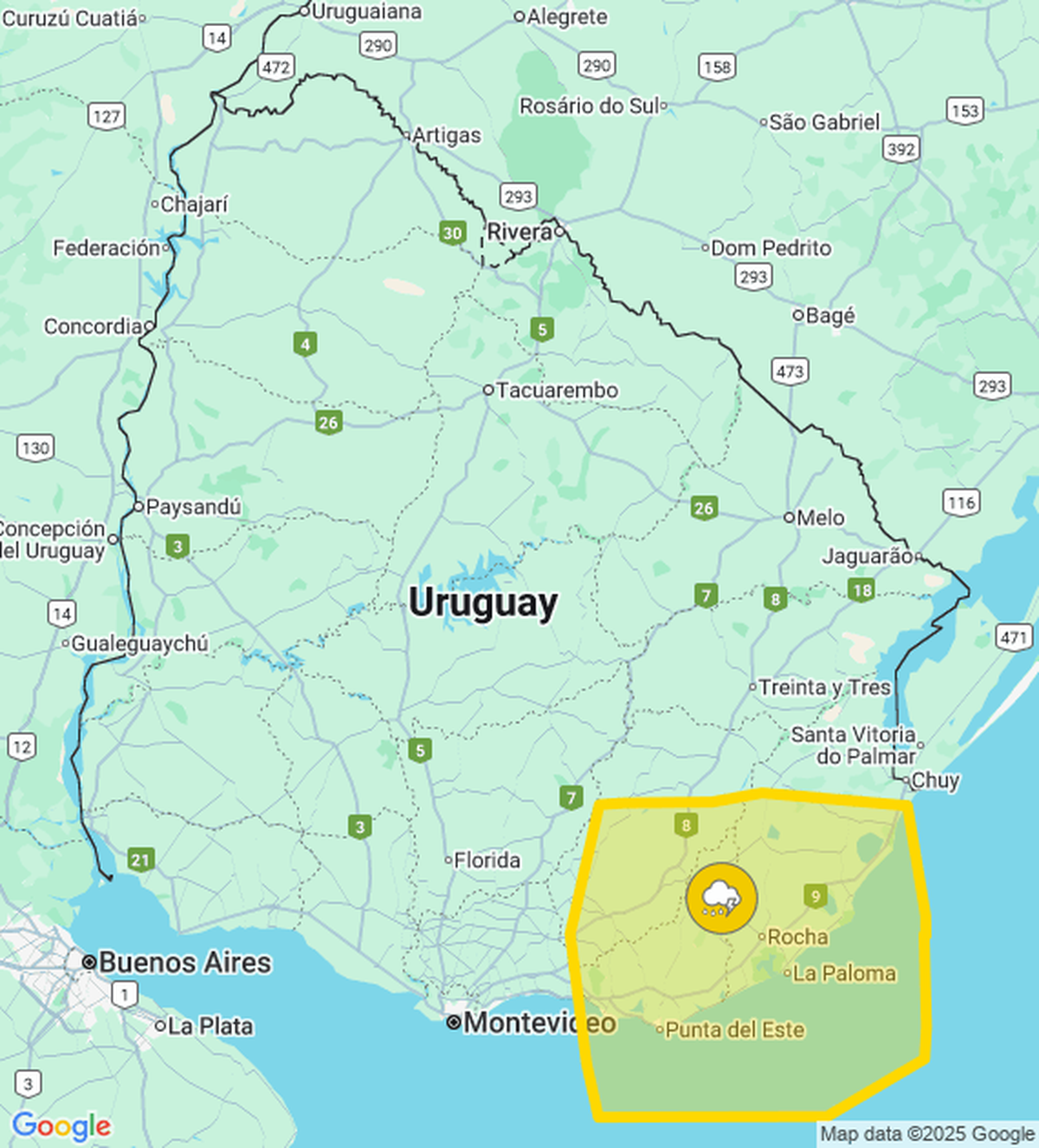 El Instituto Uruguayo de Meteorología (Inumet) emitió en la tarde de este lunes una advertencia amarilla para parte del país por tormentas puntualmente fuertes. Se actualiza a la hora 16:45.
