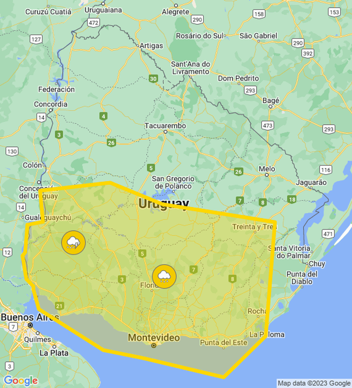 El Instituto Uruguayo de Meteorología (Inumet) actualizó la alerta amarilla que rige para gran parte del país por tormentas fuertes y lluvias intensas. Se actualiza a la hora 23:30 de este viernes.