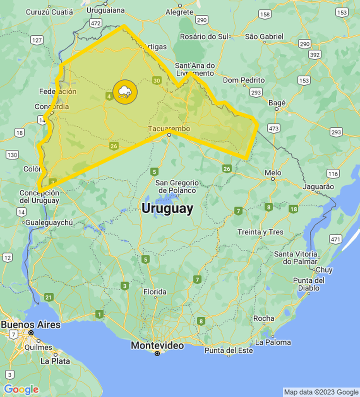El Instituto Uruguayo de Meteorología (Inumet) emitió una alerta amarilla por la persistencia de tormentas y lluvias para el norte del país. Abarca localidades de cinco departamentos, y se actualizará a la hora 16:00 de este martes.