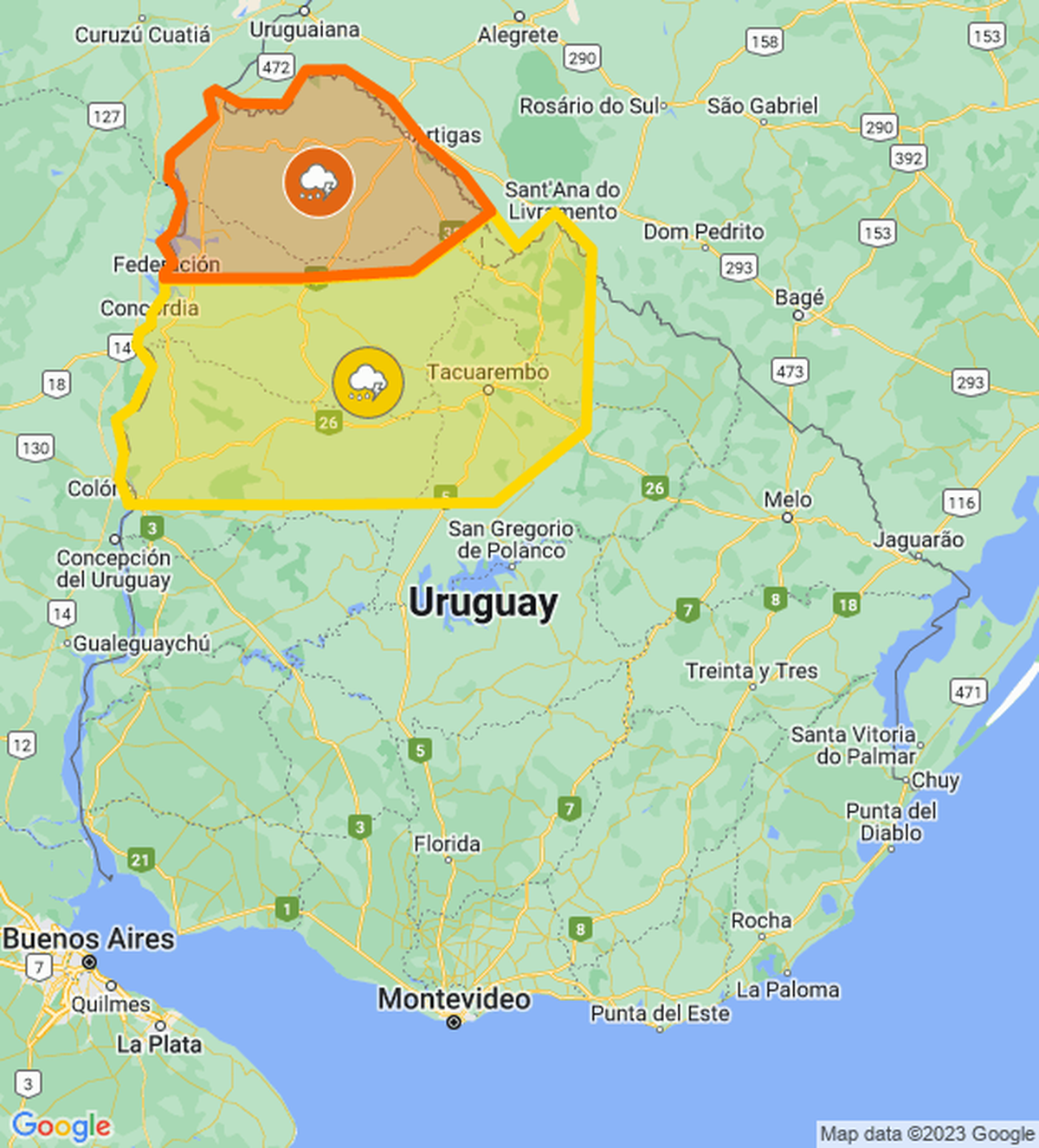 Departamentos del norte del país están bajo una doble alerta del Instituto Uruguayo de Meteorología.