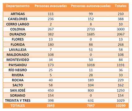 De acuerdo al último informe del SINAE, son 10.290 las personas que debieron dejar sus casas en 18 departamentos. Maldonado, Colonia, Durazno y más.