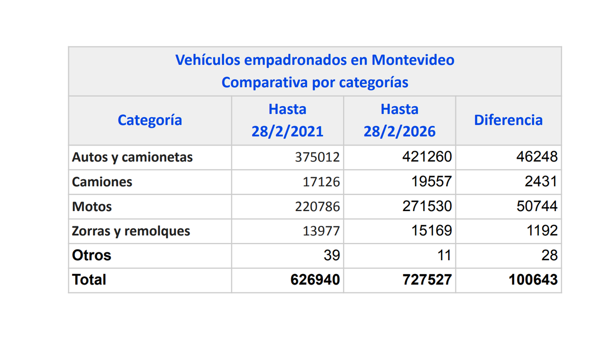 El número de vehículos empadronados en Montevideo creció de forma sostenida en los últimos cinco años y superó las 727.000 unidades, de acuerdo con información oficial de la Intendencia.