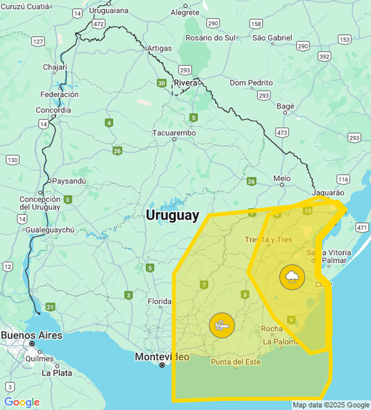 El Instituto Uruguayo de Meteorología (Inumet) publicó una advertencia amarilla por persistencia de lluvias y vientos, en la tarde de este martes. Se actualiza a la hora 18:00.
