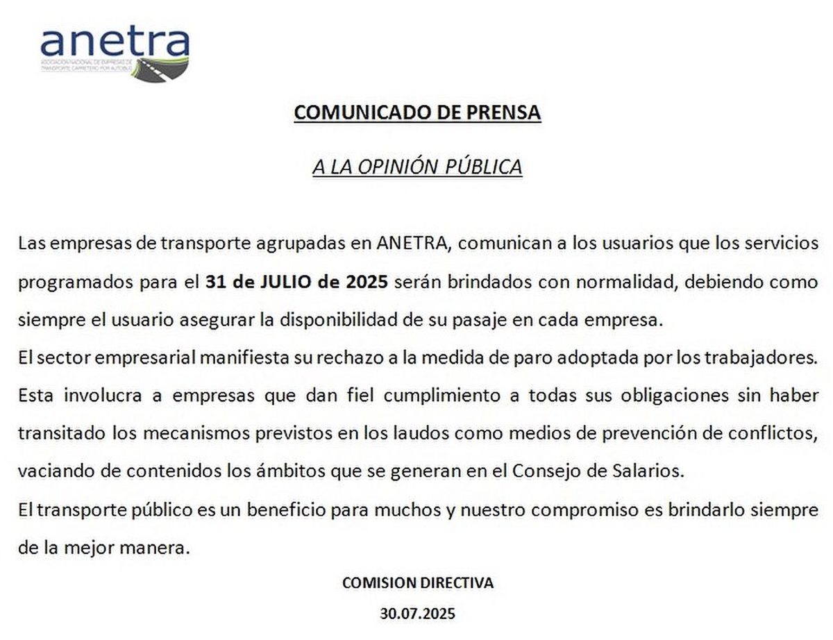 Lo mismo sucede con los ómnibus interdepartamentales. La Asociación Nacional de Empresas de Transporte Carretero por Autobús (Anetra) afirmó que brindará servicios con normalidad este jueves y se mostró en desacuerdo con la medida, por involucrar "empresas que dan fiel cumplimiento a sus obligaciones".