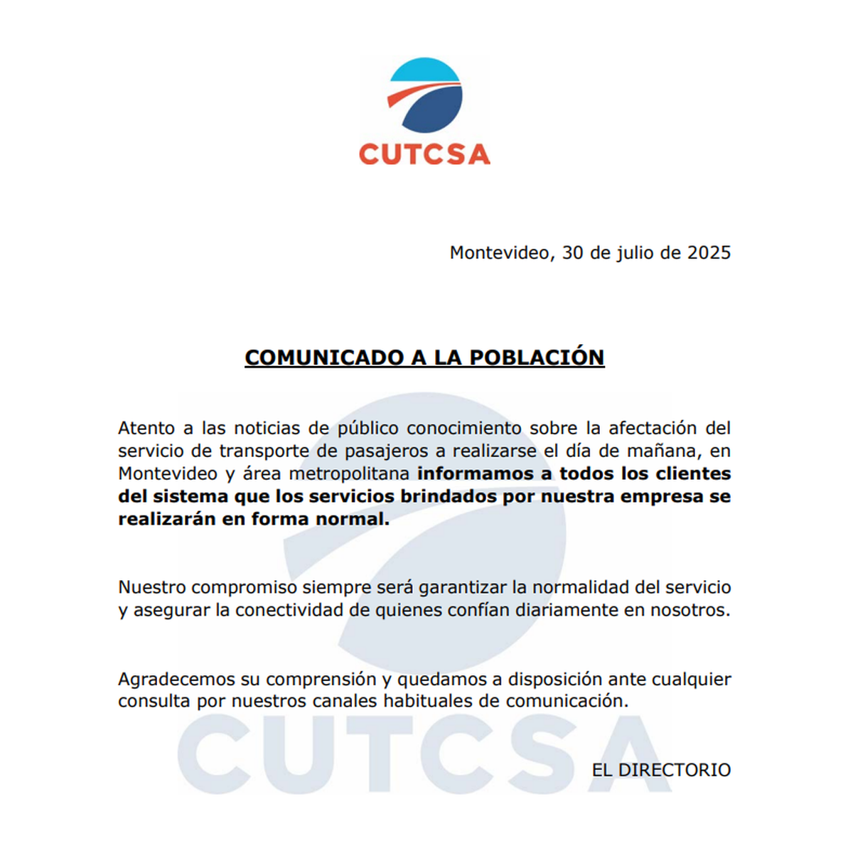 "Nuestro compromiso siempre será garantizar la normalidad del servicio y asegurar la conectividad de quienes confían diariamente en nosotros", dice el comunicado.