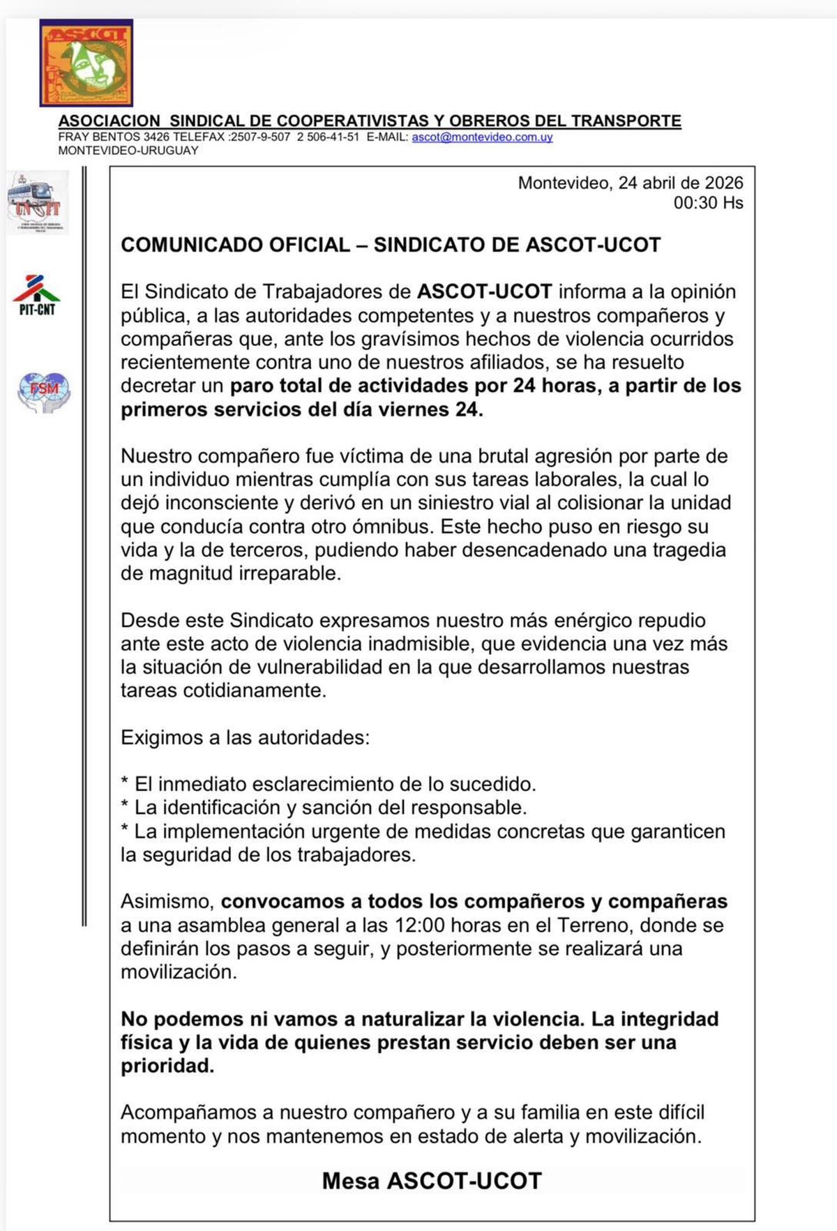 “Ante los gravísimos hechos de violencia ocurridos recientemente contra uno de nuestros afiliados, se ha resuelto decretar un paro total de actividades por 24 horas, a partir de los primeros servicios del viernes 24”, dice el comunicado.