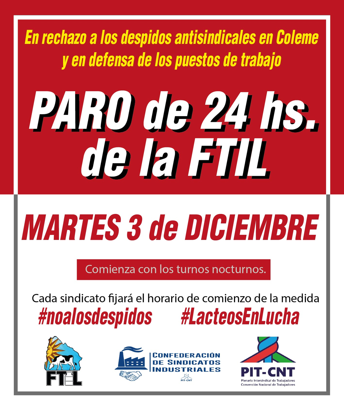 La Federación de Trabajadores de la Industria Láctea resolvió un paro de 24 horas para este martes 3 de diciembre, que comienza con los turnos nocturnos de este lunes. La medida fue resuelta en asamblea este lunes, por despidos en la cooperativa de Cerro Largo.