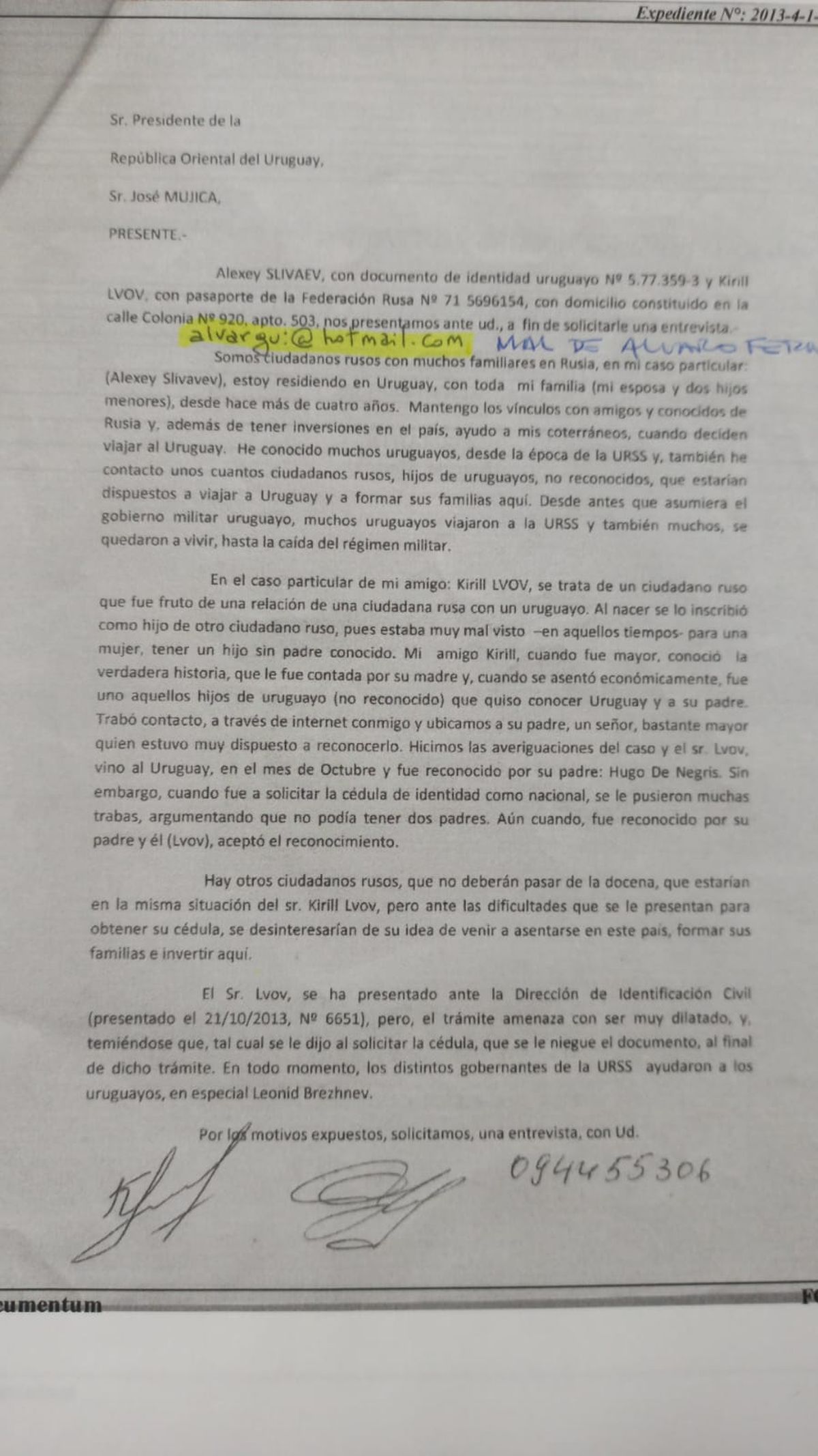 Heber detalló que en 2013 se detectó un caso de un ciudadano ruso con un padre ruso y otro uruguayo que solicitó pasaporte y cédula uruguaya: "Es ahí cuando empieza. Pretendiendo sacar una cédula y un pasaporte en nuestro país, como hijo de uruguayo. Identificación Civil niega el pasaporte", afirmó.