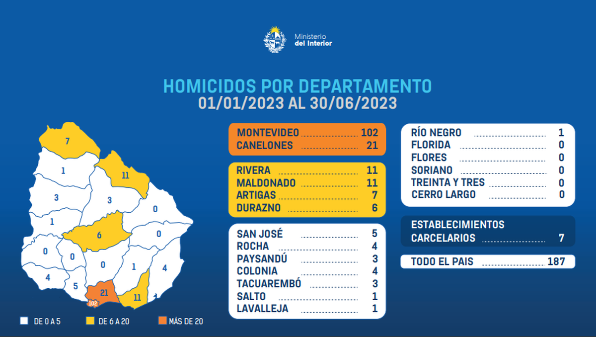 Luego dijo que los homicidios suceden más en Montevideo y Canelones, que se debe a la población, aclaró y que "ha habido un aumento en Artigas , Maldonado y en Durazno. Rivera sigue con los mismos guarismos que el año pasado". En ese sentido, ha aumentado de tres a siete los homicidios en Artigas, por disputas territoriales de bandas criminales en la zona. También en Durazno, donde se pasó de tres a seis homicidios de un año al otro. En Maldonado se pasó de siete a 11, dijo Heber.