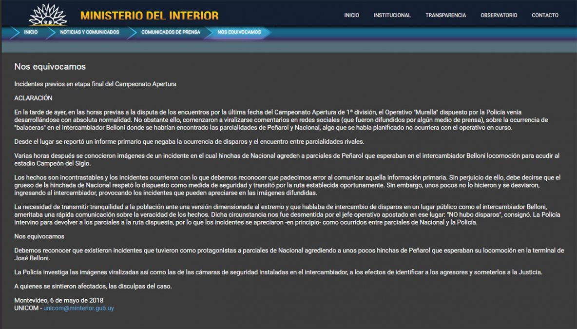 Agrega que “desde el lugar se reportó un informe primario que negaba la ocurrencia de disparos y el encuentro entre parcialidades rivales. Varias horas después se conocieron imágenes de un incidente en el cual hinchas de Nacional agreden a parciales de Peñarol que esperaban en el intercambiador Belloni locomoción para acudir al estadio Campeón del Siglo. Los hechos son incontrastables y los incidentes ocurrieron con lo que debemos reconocer que padecimos error al comunicar aquella información primaria. Sin perjuicio de ello, debe decirse que el grueso de la hinchada de Nacional respetó lo dispuesto como medida de seguridad y transitó por la ruta establecida oportunamente. Sin embargo, unos pocos no lo hicieron y se desviaron, ingresando al intercambiador, provocando los incidentes que pueden apreciarse en las imágenes difundidas”.