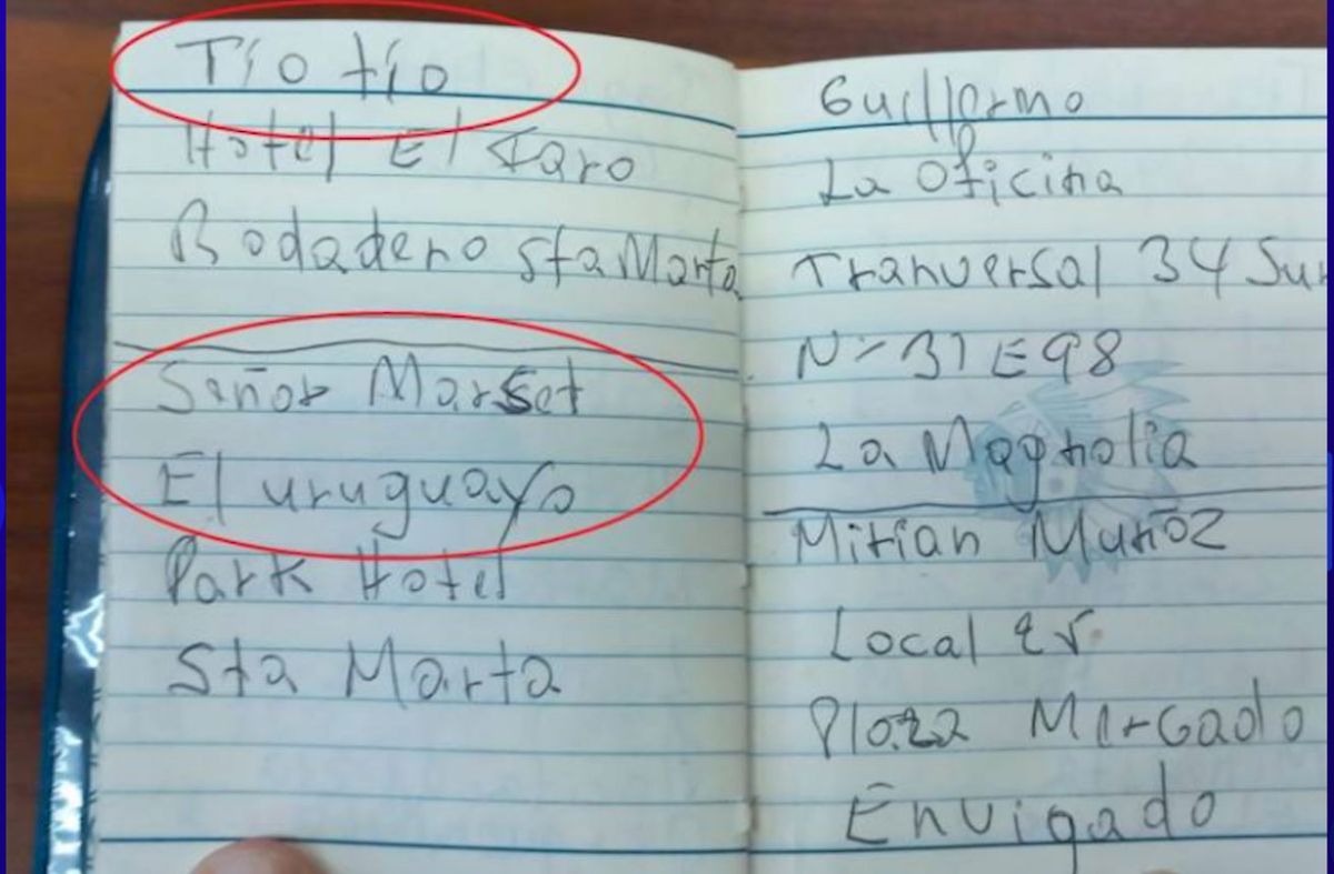 Allí, aparece el nombre del narcotraficante Sebastián Marset. Según la imagen de la libreta divulgada, la anotación dice: "Señor Marset. El uruguayo. Park Hotel. Sta Marta".