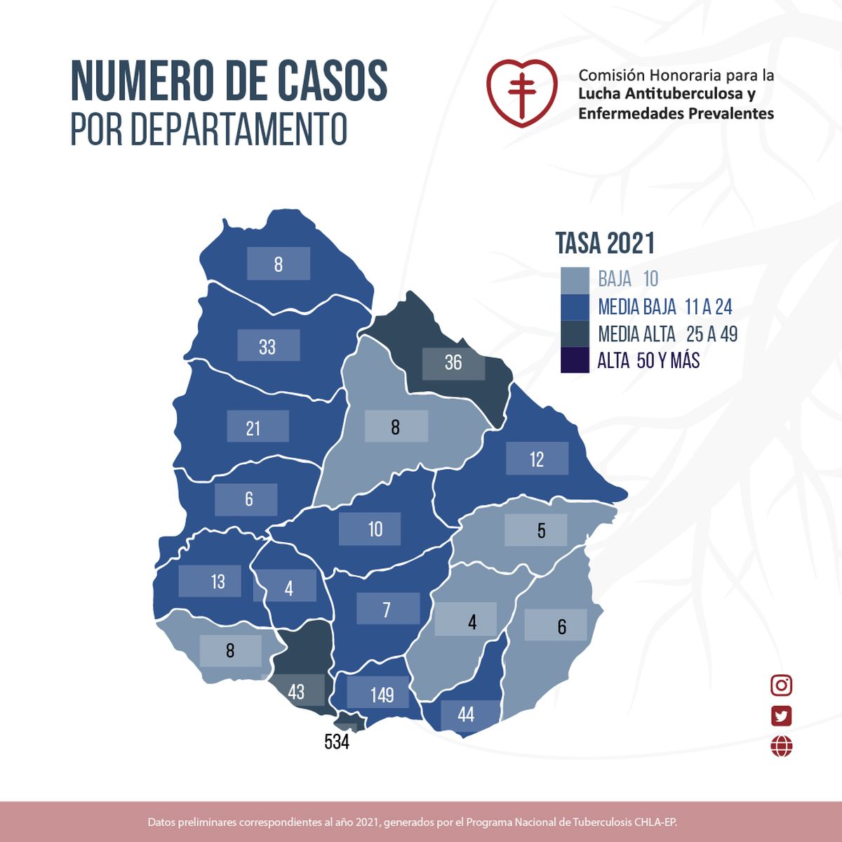 Según el informe de la CHLAEP, la tasa de incidencia de tuberculosis en Uruguay es de 26,8 cada 100.000 habitantes. La Organización Mundial de la Salud (OMS) sostiene que Uruguay está por encima del promedio de las Américas.