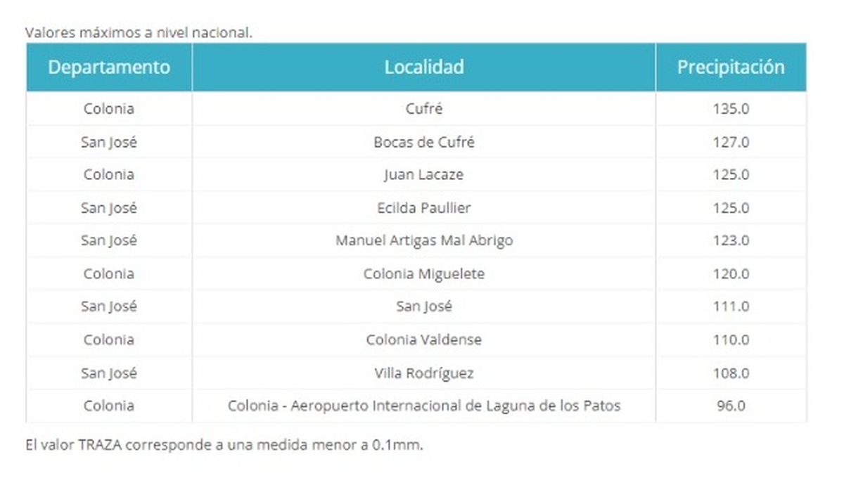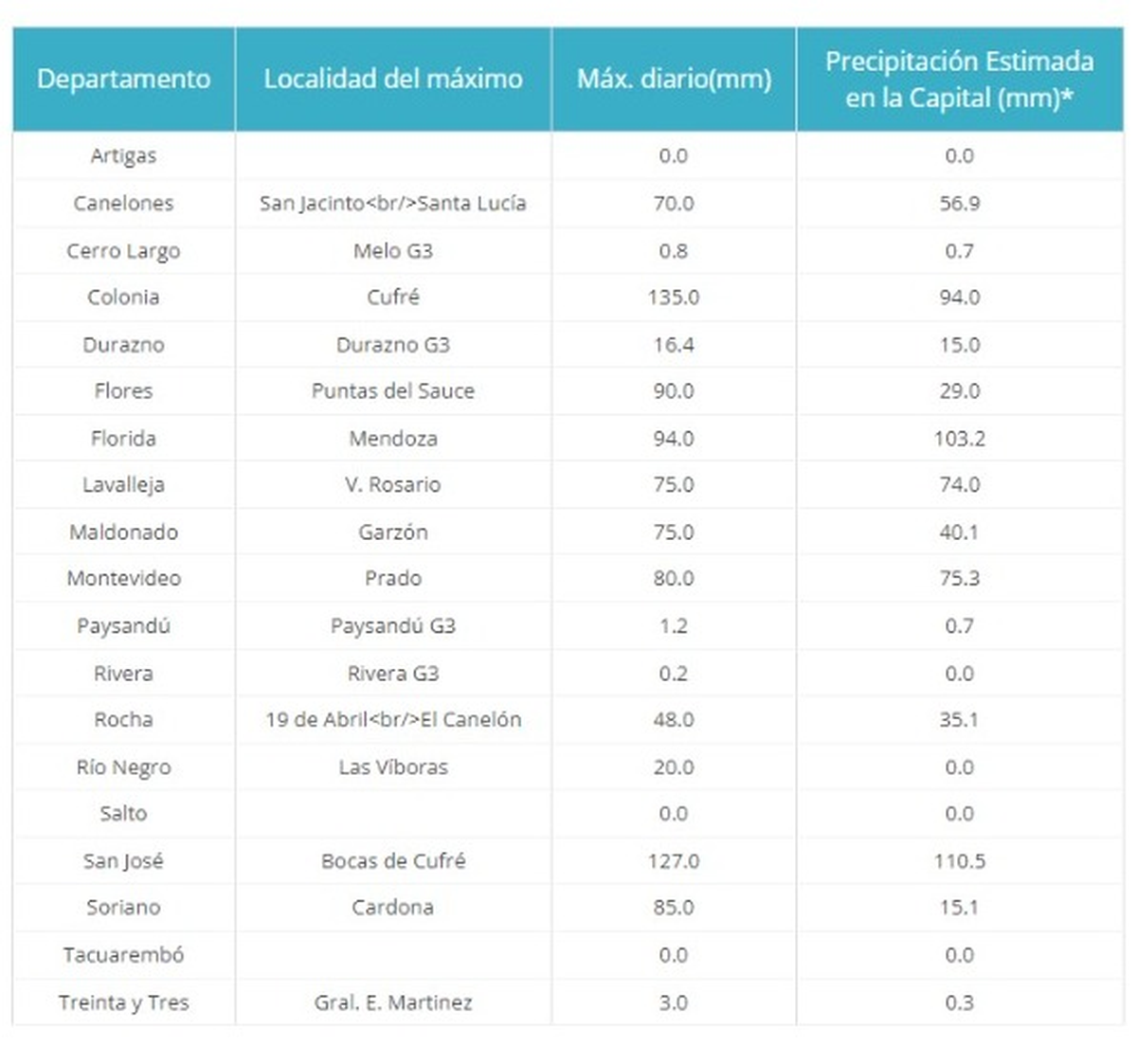 Las localidades donde más llovió fueron Cufré, en Colonia (135 mm.); Bocas de Cufré, en San José (127 mm.); Juan Lacaze, en Colonia (125 mm.); Ecilda Paullier, en San José (125 mm.); Mal Abrigo, en San José (123 mm.); Colonia Miguelete, en Colonia (120 mm.); San José de Mayo (111 mm.); Colonia Valdense, en Colonia (110 mm.); y Villa Rodríguez, en San José (108 mm.).