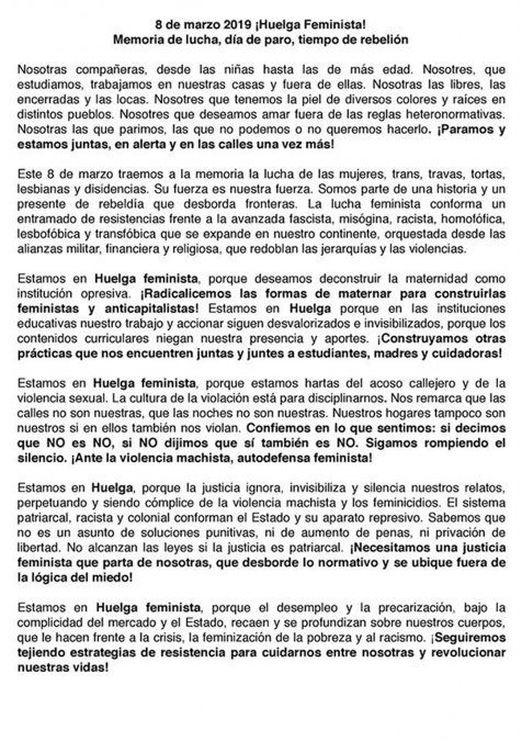 “Estamos en huelga feminista porque estamos hartas del acoso callejero y de la violencia sexual. La cultura de la violación está para disciplinarnos”, dice más adelante, y agrega: “nuestros hogares tampoco son nuestros si en ellos también nos violan”.