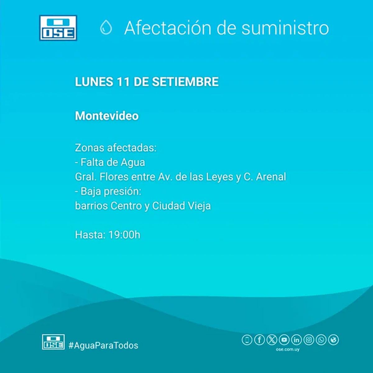 Cerca de las 13:30 horas OSE publicó un comunicado sobre la rotura del caño troncal en el que advierte que el Centro y la Ciudad Vieja tendrán baja presión de agua hasta la hora 19 de este lunes.