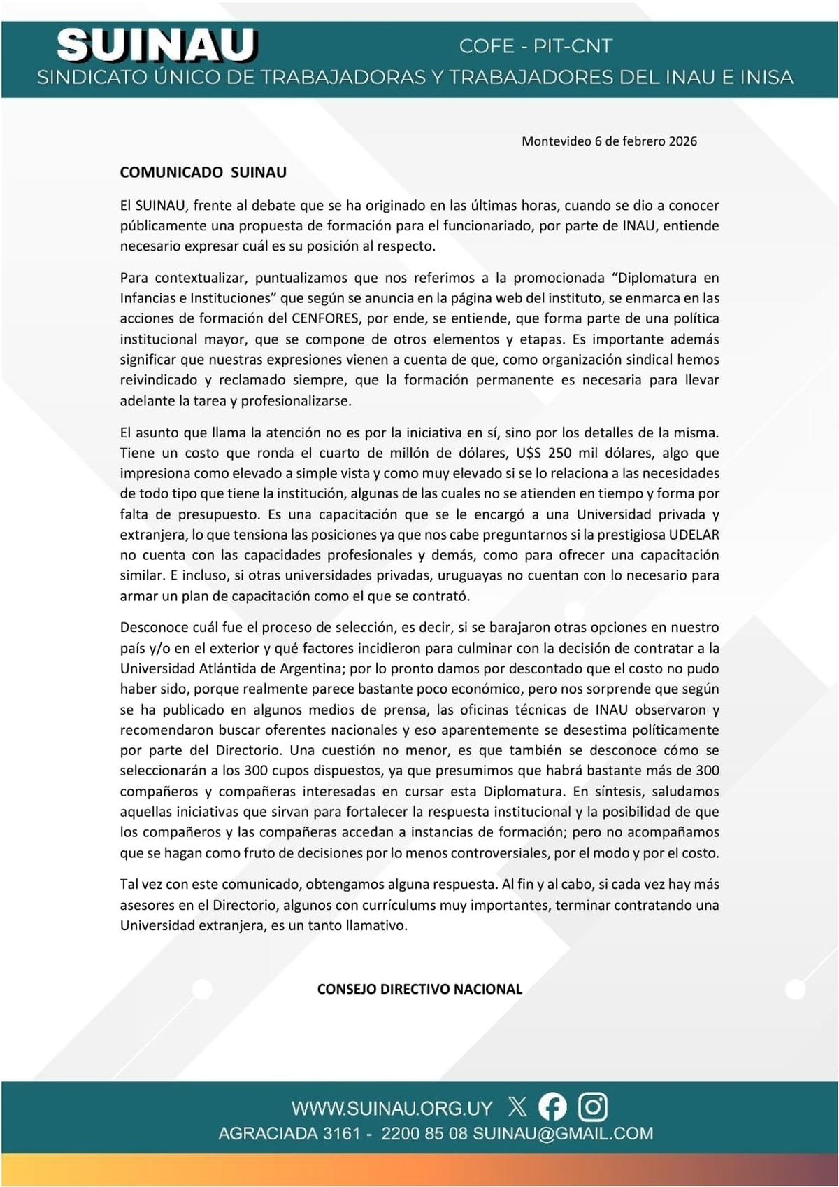 Respecto al proceso de selección y a que se eligiera una universidad extranjera, piden conocer los factores que llevaron a que no sea uruguaya y que además sea privada. "Nos sorprende que según se ha publicado en algunos medios de prensa, las oficinas técnicas de INAU observaron y recomendaron buscar oferentes nacionales y eso aparentemente se desestima políticamente por parte del Directorio", escribieron.