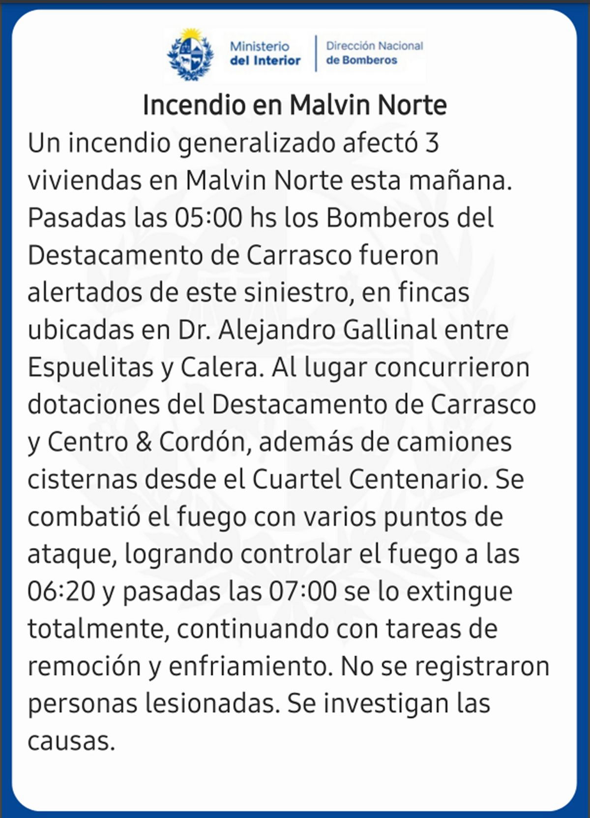 Un incendio afectó este lunes de madrugada a tres viviendas del barrio Malvín Norte, en la calle Gallinal esquina Espuelitas.