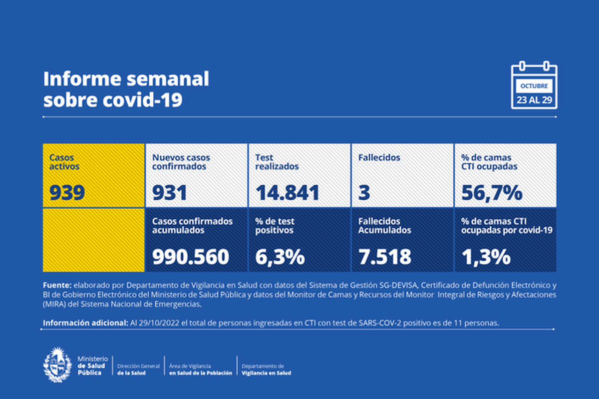 El Ministerio de Salud Pública (MSP) publicó este lunes el informe semanal con los datos sobre covid-19 en el país. Del 23 al 29 de octubre, se confirmaron 931 casos nuevos de la enfermedad en 14.841 test y fallecieron tres personas. Actualmente, hay 939 casos activos de coronavirus.