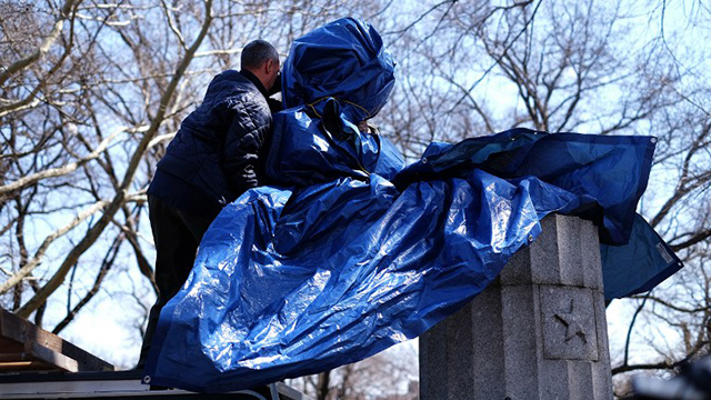 Para el mediodía, las autoridades ya habían cubierto la estatua -hecha con un tipo de yeso conocido como hidrocal y que pesa unos 45 kilos- y la inscripción con una tela azul, lo que no impedía que los turistas se fotografiaran frente a la misma. Poco después, el busto fue retirado.