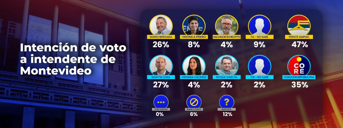 Intención de voto en Montevideo: Frente Amplio 47%, Coalición Republicana 35%. Bergara y Lema parten con ventaja
