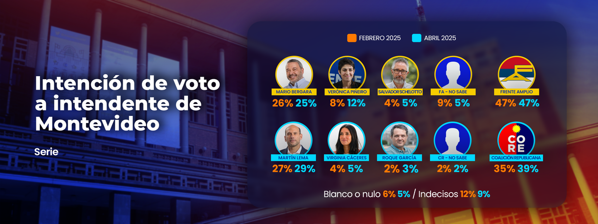 El Frente Amplio lidera las preferencias con 47%, superando en 8 puntos a la Coalición Republicana, que suma 39%. Hay 5% de montevideanos que se inclinan a votar en blanco o nulo, y 9% que permanecen indecisos.
