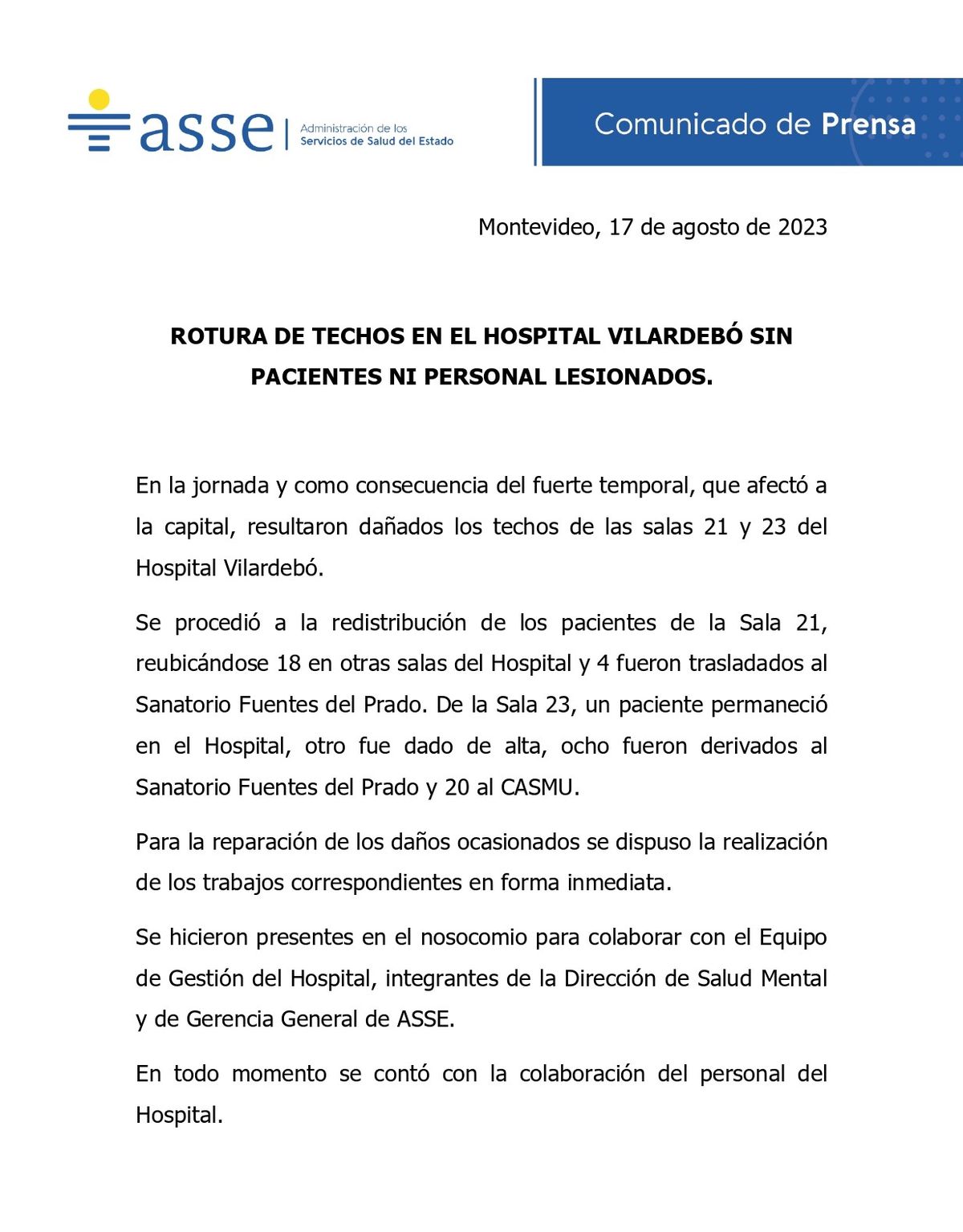 En la sala 21, había 22 pacientes, de los cuales 18 fueron reubicados en otras salas del hospital y 4 trasladados al Sanatorio Fuentes del Prado. En la sala 23, había 30 pacientes, uno de fue dado de alta, otro permanece en el hospital, 8 derivados al Sanatorio Fuentes del Prado y 20 al Casmu, informó ASSE en un comunicado.