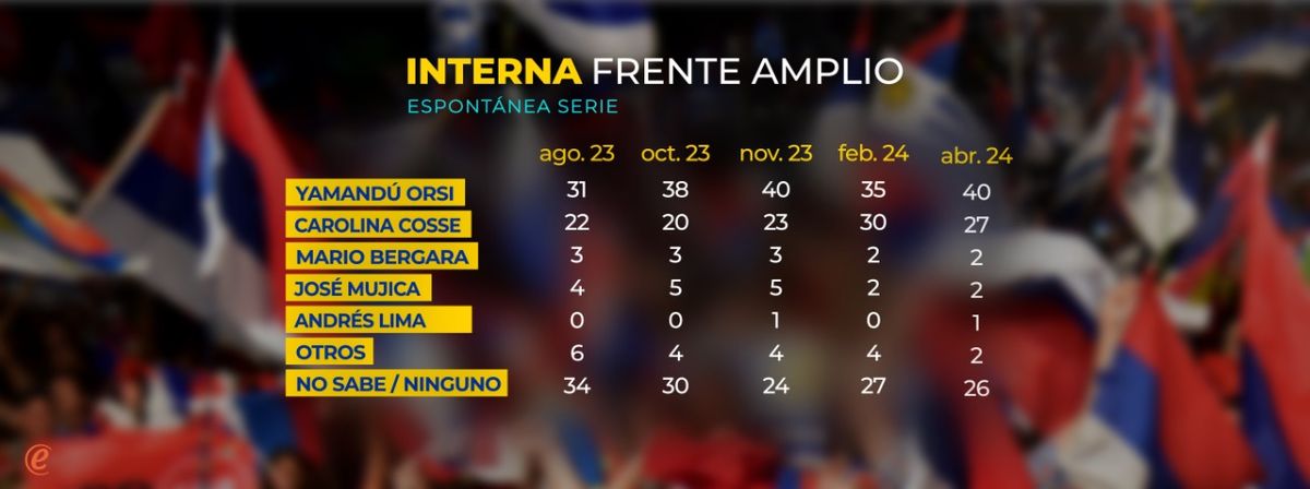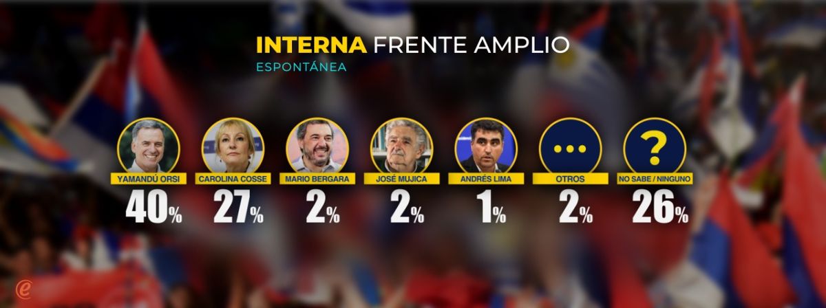 En las respuestas espontáneas, Orsi recibe 40% de las preferencias, seguido de Carolina Cosse con 27%, mientras que Mario Bergara continúa recibiendo un 2% y Andrés Lima 1%. Uno de cada cuatro frenteamplistas (26%) sigue sin manifestar preferencias espontáneas.