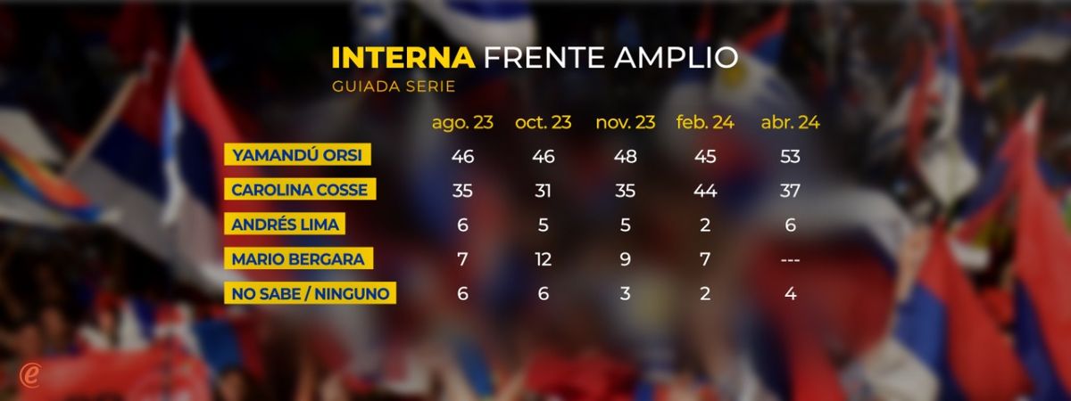 Mirado en retrospectiva, la interna frenteamplista ha tenido ciertas oscilaciones, tanto en la pregunta espontánea como en la guiada, particularmente en la medición de febrero. Si bien el orden entre los candidatos ha permanecido estable (Orsi por encima de Cosse) las magnitudes han tenido variaciones, lo que sugiere que hay electores frenteamplistas que aún no han cristalizado sus preferencias. Dado que ambos precandidatos reciben niveles de simpatías muy altos entre los adherentes frenteamplistas, no es descartable que estas oscilaciones puedan continuar también en las próximas semanas hasta la interna.