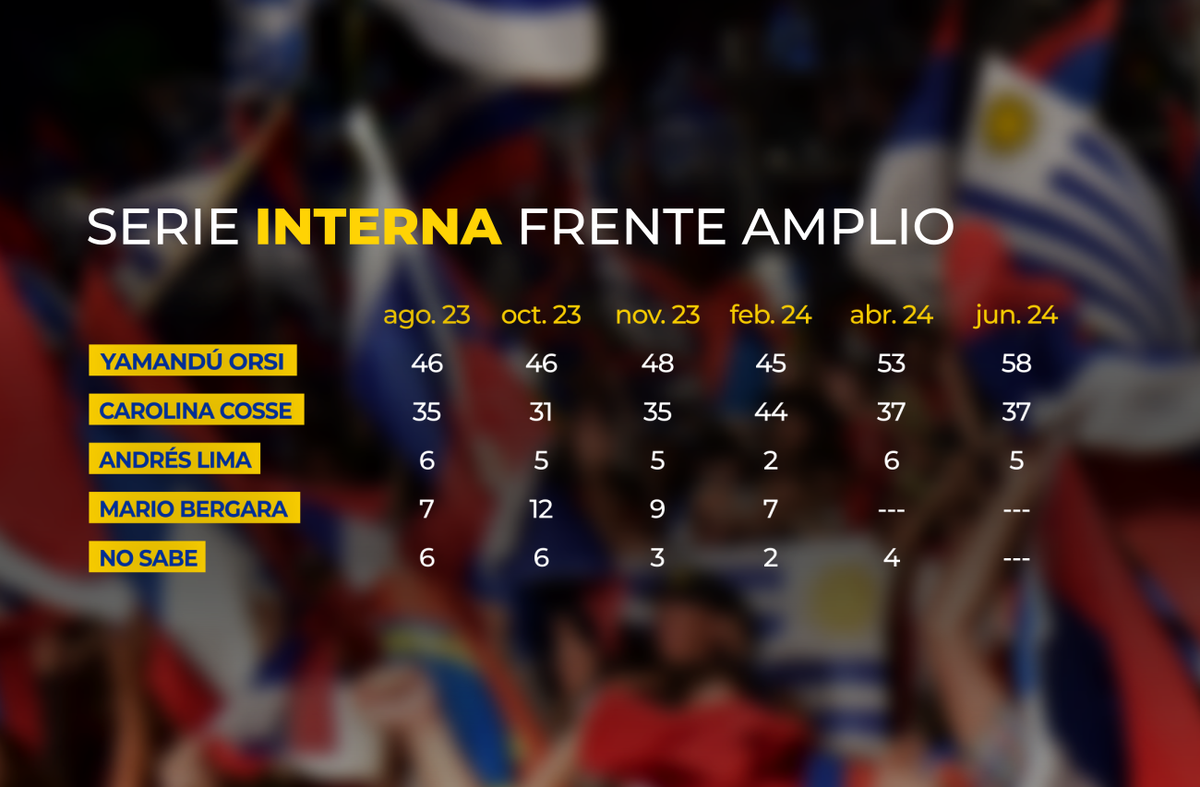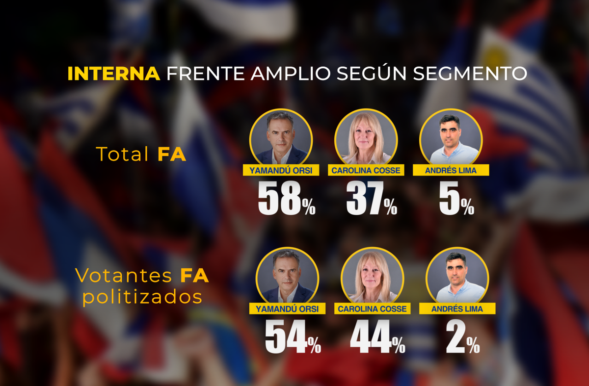 En la última medición correspondiente a la primera quincena de junio, si se considera el total de frenteamplistas, Yamandú Orsi recibe el 58% de las adhesiones, contra 37% de Carolina Cosse y 5% de Andrés Lima. Los resultados lucen similares a los de la medición anterior, incluso con una diferencia algo mayor a favor de Orsi.