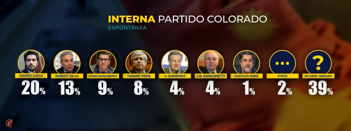 En la pregunta espontánea, cuatro de cada diez colorados (39%) no menciona ningún nombre preferido. El más mencionado de los candidatos es Andrés Ojeda con 20%, seguido de Robert Silva con 13%. El resto de los candidatos continúa con menciones espontáneas por debajo del 10%. El movimiento más notorio de estos últimos meses es el crecimiento de Andrés Ojeda, y la disminución de menciones a Pedro Bordaberry (sobre quien pesaba la expectativa de una eventual candidatura).