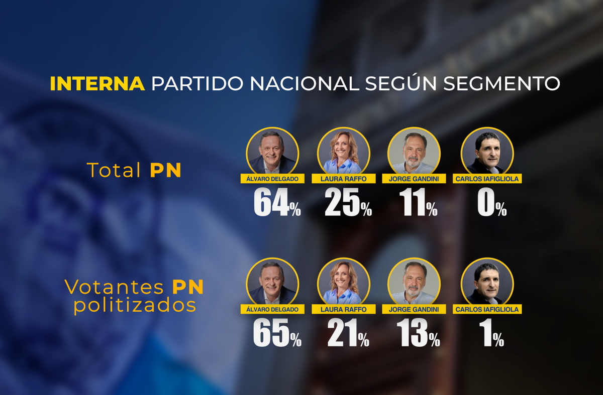 Al llegar a la primera quincena de junio, si se analizan los datos en el total de nacionalistas, Delgado muestra una ventaja holgada sobre el resto de los competidores. Delgado obtiene 64% de las preferencias, contra 25% de Laura Raffo y 11% de Jorge Gandini. Delgado ha mostrado una tendencia creciente en los últimos meses, y lo mismo ocurre (en menor medida) con Gandini, elementos que hay que tomar en cuenta para evaluar los posibles escenarios finales.
