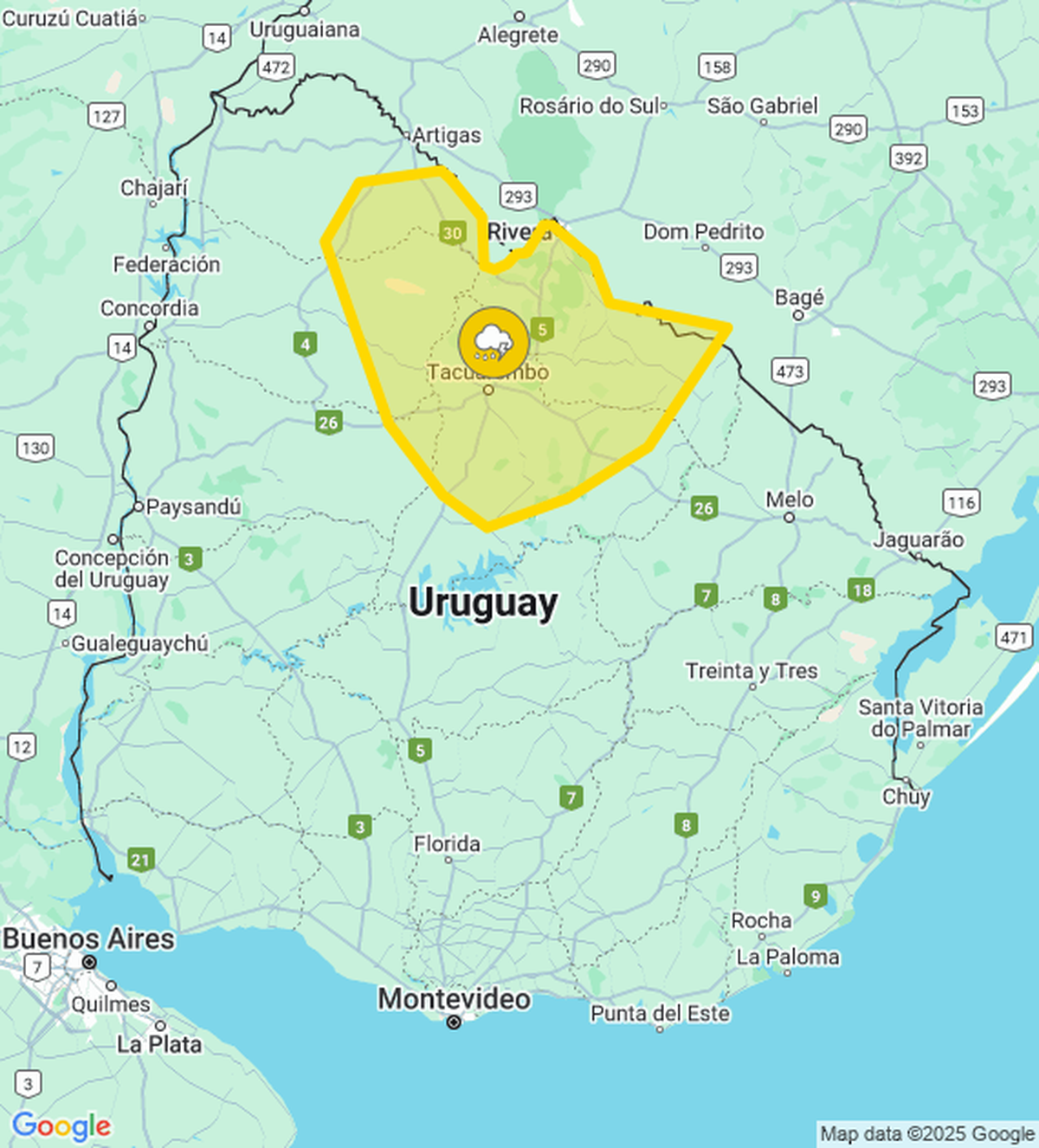 El Instituto Uruguayo de Meteorología (Inumet) actualizó la alerta amarilla por tormentas fuertes y lluvias intensas para localidades de cinco departamentos.