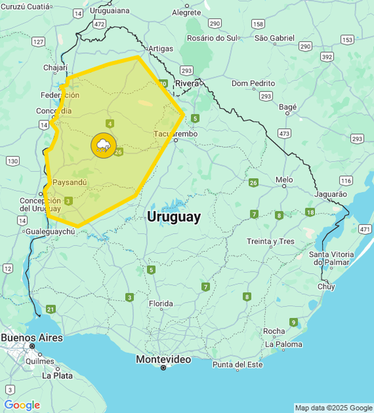 Las localidades ubicadas en el litoral oeste de Uruguay están bajo advertencia meteorológica amarilla. Mirá el detalle.
