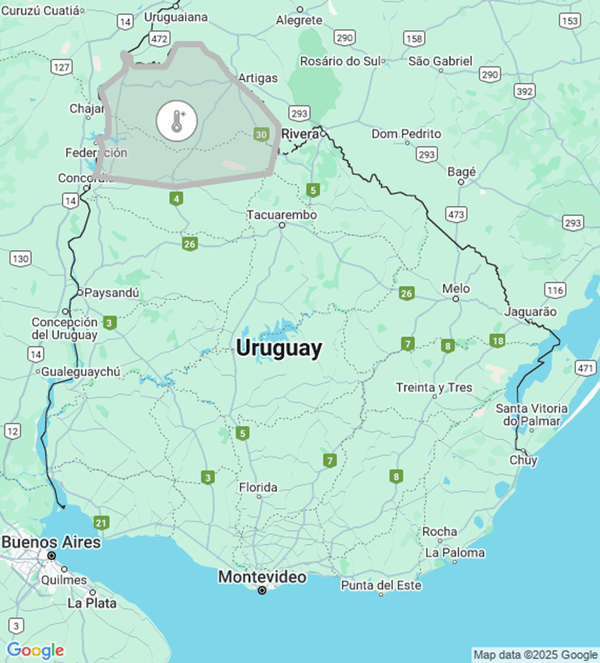 Los departamentos afectados por la ola de calor son Artigas (todo el departamento) y Salto (de forma parcial).