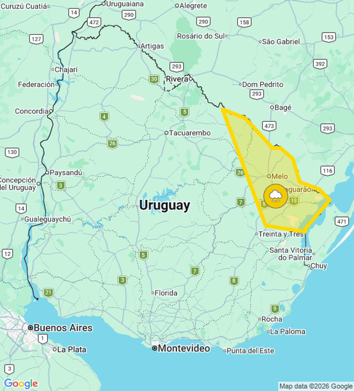 El Instituto Uruguayo de Meteorología (Inumet) emitió una advertencia amarilla por persistencia de tormentas puntualmente fuertes y lluvias abundantes, que se actualizará a la hora 16:20.
