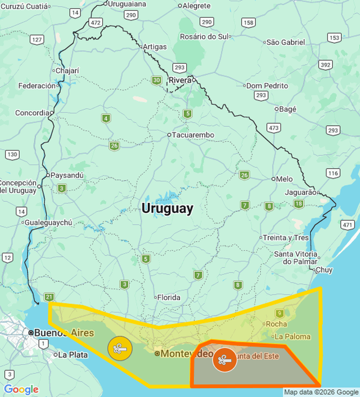 La advertencia naranja rige para Maldonado. Mientras que la advertencia amarilla abarca Canelones, Colonia, Lavalleja, Maldonado, Montevideo, Rocha y San José.