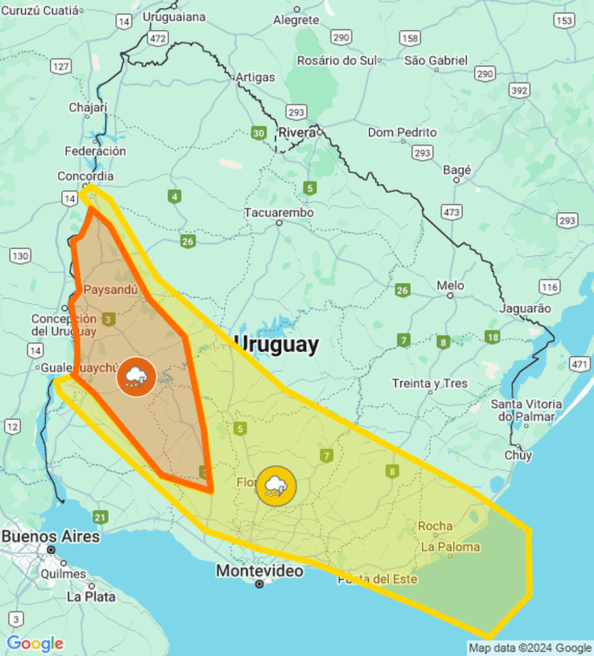 El Instituto Uruguayo de Meteorología (Inumet) emitió una alerta naranja y actualizó la de color amarillo por tormentas fuertes y lluvias intensas.