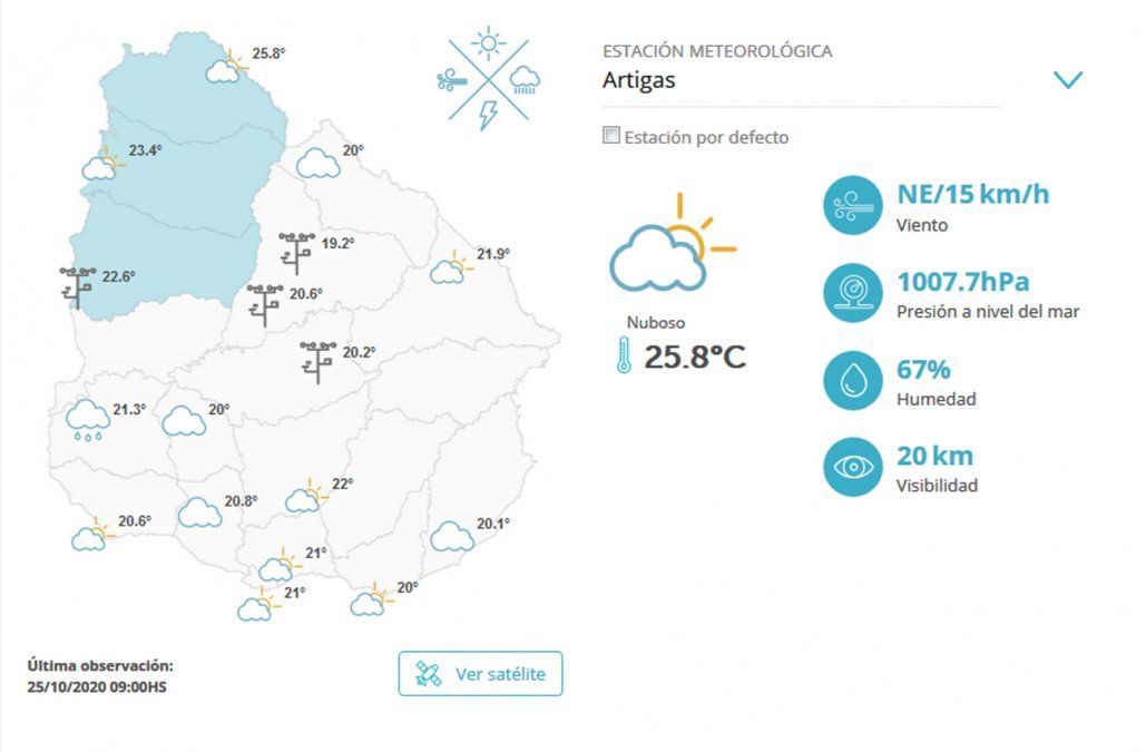 INUMET extendió la alerta meteorológica naranja por tormentas fuertes y lluvias intensas hasta 17:30hs, por un frente frío que se aproxima por el litoral oeste, favoreciendo el desarrollo de lluvias y tormentas fuertes y severas. Cabe destacar que en zonas de tormentas podrá registrarse ocasional caída de granizo, intensa actividad eléctrica y rachas de viento muy fuertes. Rige para Artigas: Baltasar Brum, Bella Unión, Bernabé Rivera, Cainsa, Colonia Palma, Coronado, Diego Lamas, Franquia, Javier de Viana, Mones Quintela, Paso Campamento, Portones de Hierro y Campodónico, Santa Rosa del Cuareim, Sequeira, Tomás Gomensoro y Topador. Paysandú: Casa Blanca, Cerro Chato, Chacras de Paysandú, Chapicuy, Colonia Nuevo Paysandú, Constancia, Esperanza, Gallinal, Guayabos, Lorenzo Geyres, Orgoroso, Paysandú, Piedras Coloradas, Porvenir, Quebracho, San Félix y Termas de Guaviyú. Salto: Albisu, Arapey, Belén, Biassini, Campo de Todos, Cayetano, Cerro de Vera, Colonia 18 de Julio, Colonia Itapebí, Constitución, Garibaldi, Itapebí, Lluveras, Migliaro, Puntas de Valentín, Rincón de Valentín, Salto, San Antonio, Saucedo, Termas del Arapey y Termas del Daymán.