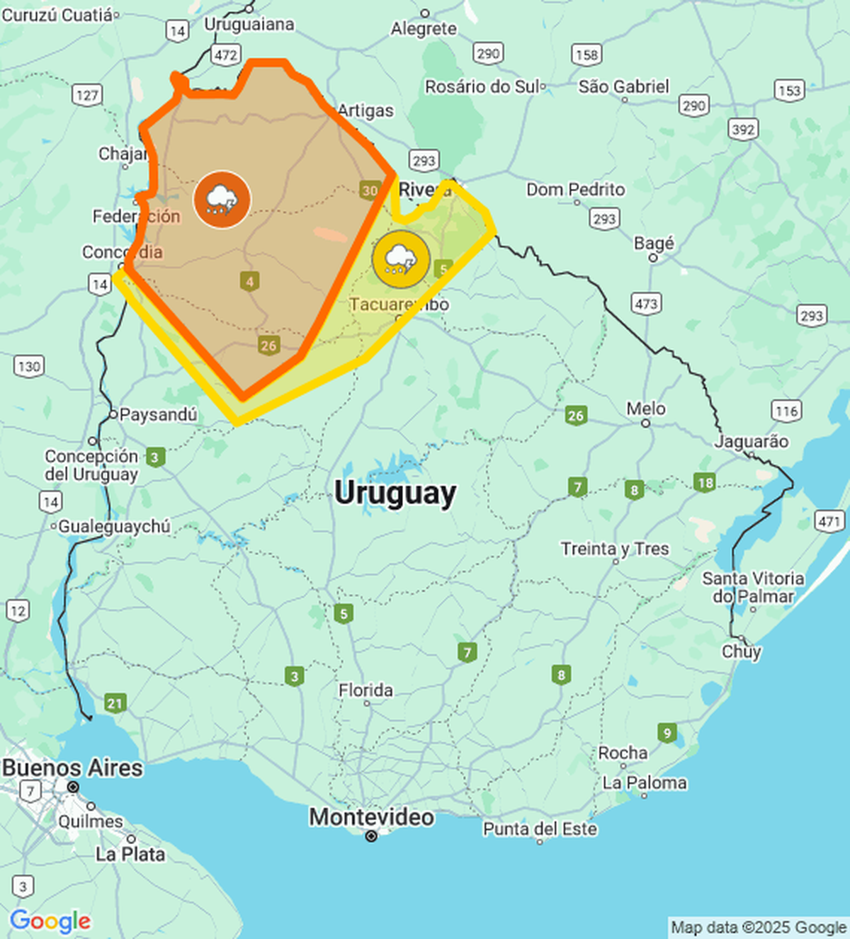 El Instituto Uruguayo de Meteorología (Inumet) publicó dos advertencias meteorológicas, en el mediodía de este jueves, para el norte del país: una naranja y otra amarilla. Se actualizará a la hora 14:30.
