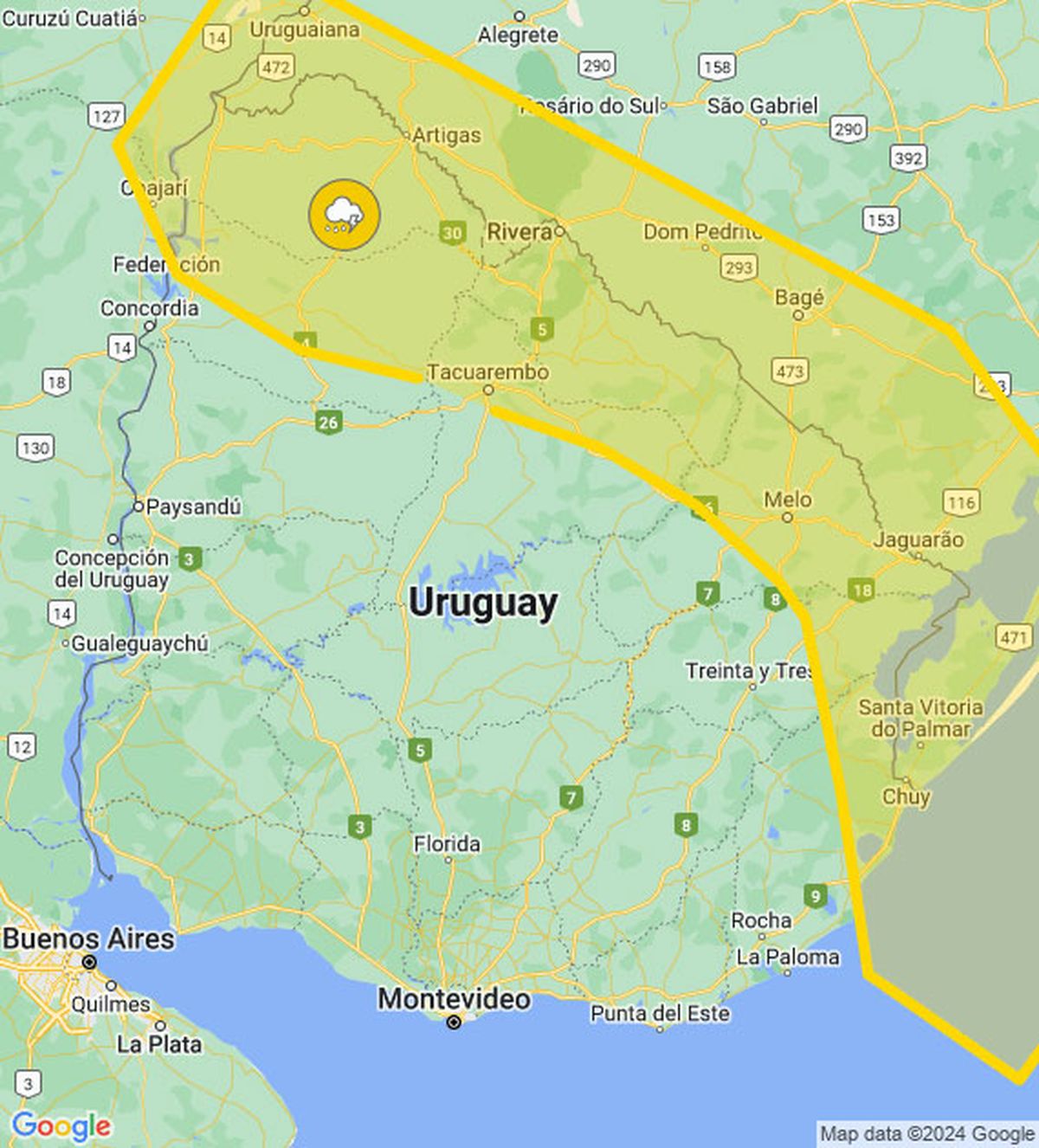 El Inumet publicó a la hora 14 una alerta amarilla por tormentas fuertes, que rige para el norte, noreste, este y sureste del país.